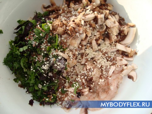 Затем добавляю семена льна и кунжут, они очень хорошо влияют на пищеварение и способствуют очистке кишечника. Солю, перчу и хорошо все перемешиваю.