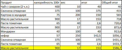 Итак, отчет за день по питанию. Несколько больше чем рассчитвала, но в пределах коридора калорийности.
